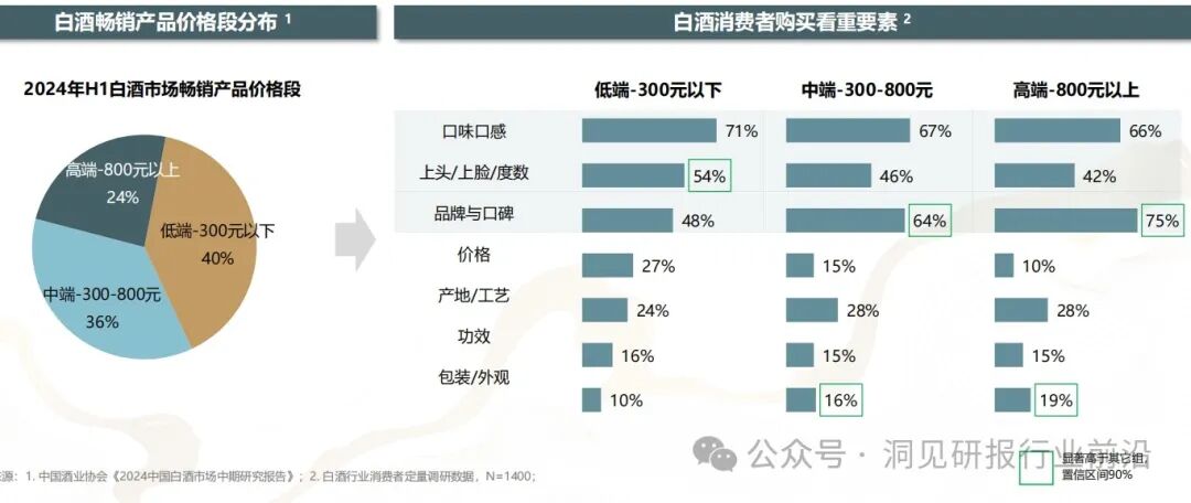 不同价位白酒购酒需求存在差异体验,口味口感是高中低端价位购酒者都关注的因素,低端白酒用户关注度更高。此外,低端白酒购买者更看重上头/上脸/度数等饮用体验,中高端白酒消费者更看重品牌与口碑。