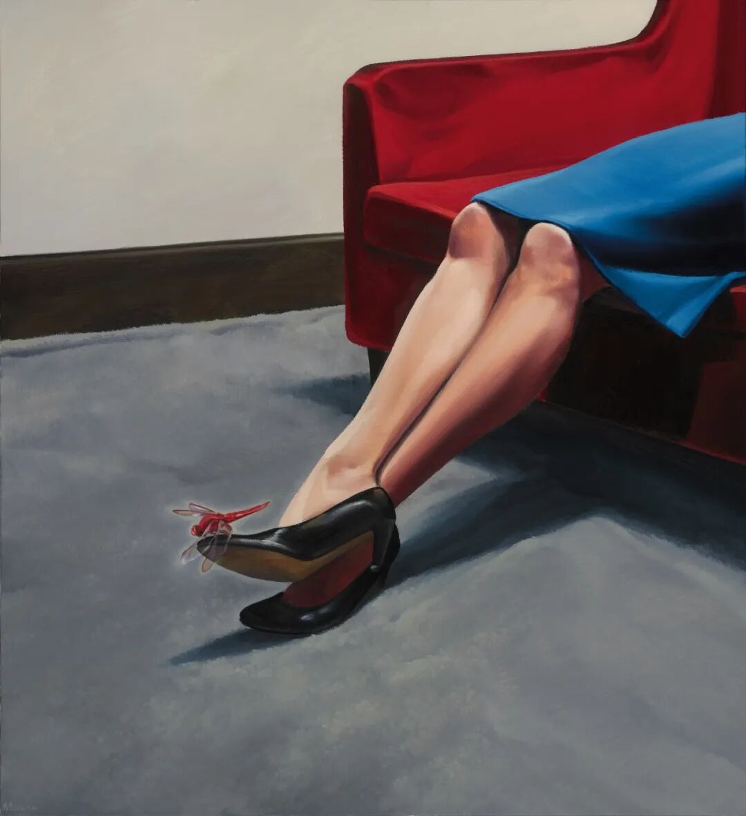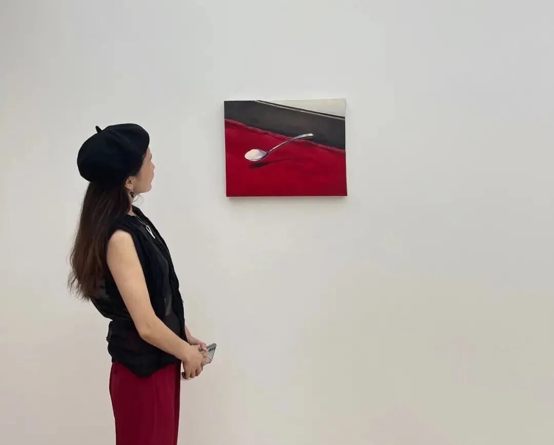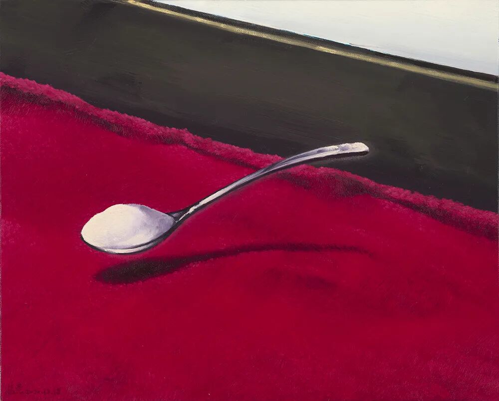 艺术家延续了以往作品大胆用色、视角独特、且具有超现实的风格,画面色彩对比强烈且具有质感,占据画面三分之二的红色夺人眼球,地面的一角、卷起毛边的红色地毯、悬浮的勺子及上面的白色物,真实而又魔幻,戏谑而又让人思考.....