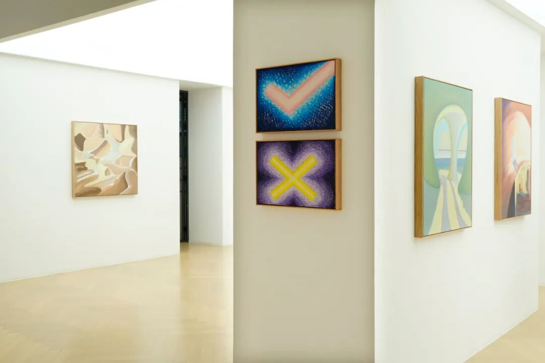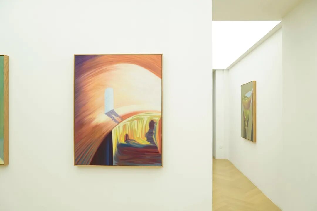 赵兵此次创作不乏“所见”之景。林荫,繁花,光晕,蔚蓝海岸,拱形空间……但赵兵并未专注于对记忆的简单描绘,而是转向了氛围与情感的真实表达。画面中意象的冲击超越了形状的呈现。柔软细腻的颜料,光与影的交错,虚与实的结合将所见瞬间的氛围注入画布。在《奇异的湛蓝时刻》《空间是时间的见证者》中,柔软虚幻的拱形背景与远处抽象明晰的景色交替,情绪在对比的缝隙中如水般温润流淌。巴尼特纽曼的亮镉红色zip诞生于1964年,而赵兵的光带则在此呈现。一幅幅画面犹如蒙雾的电影镜头,简化周遭繁复,将目光聚焦于一件事物,但又满溢着朦胧质感,似幻想,似梦境,无限接近却缥缈无垠。“所见”的物体已不再是赵兵笔下的主体,“真实”在赵兵的画中不再仅仅是“所见”之物的直白描绘,而是对“所见”瞬间记忆的表达与意象氛围的营造。至此,观者对于画面的注视转化为了身临其境对于“当时所见”的氛围的再次体会与凝视。