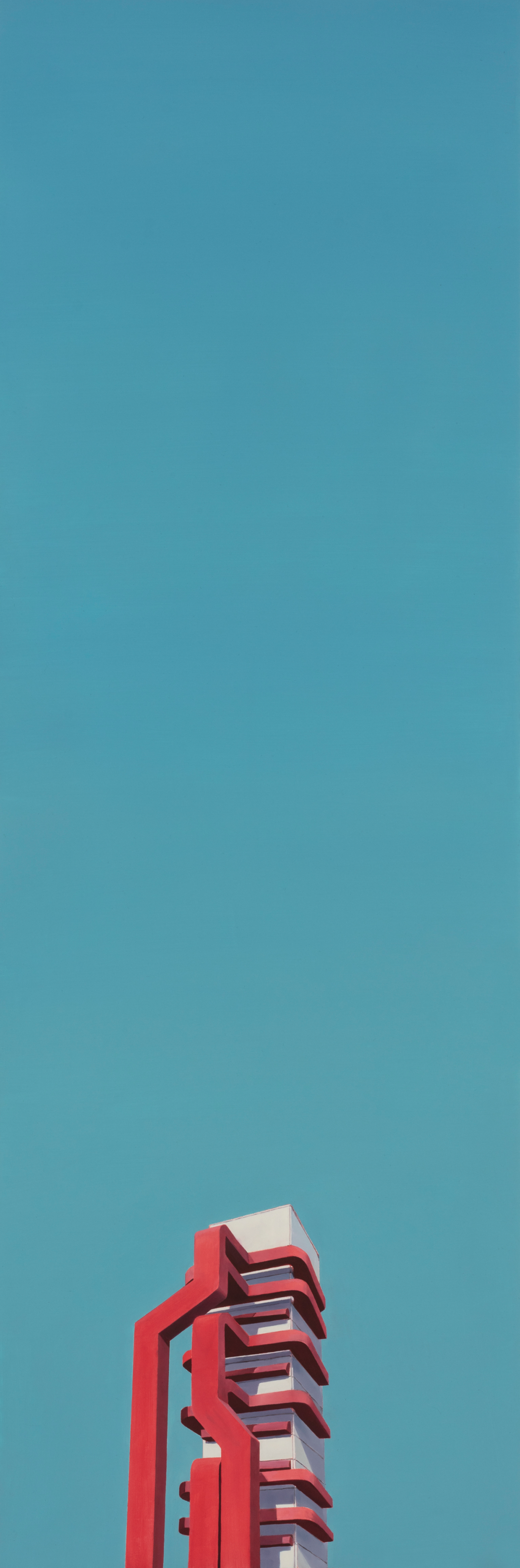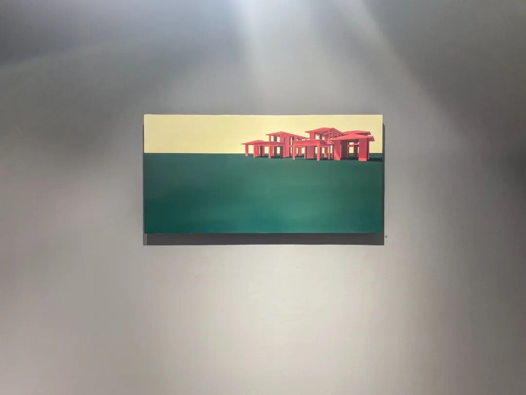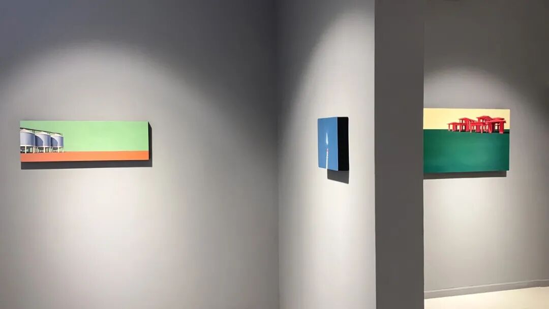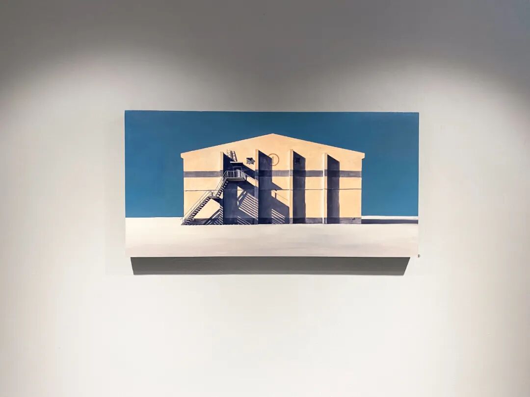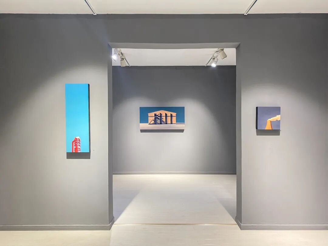 北方的建筑是吕喆很喜欢描绘的题材。他以纯色为基低,绘制房屋、厂房等等建筑。例如《抱》以蓝天为背景,大幅度留白,接着在画板下方四分之一处绘制一个红色金属环抱的塔顶或是烟囱高耸入云的画面。这是一个非常有趣的视角,艺术家并不去绘制整栋建筑。现在的人们都只顾低头看手机,自己的视野变的越来越小,抬头去看向天空,看向远方的时间越来越少。吕喆的绘画,唤起了我去重新观察周边事务的心情。作品表达了艺术家本人的情感,而艺术传达给我们的是一人一思,让我们自己去体会,去思考感受更多作品之前,艺术家情感表达之外,更多的东西。