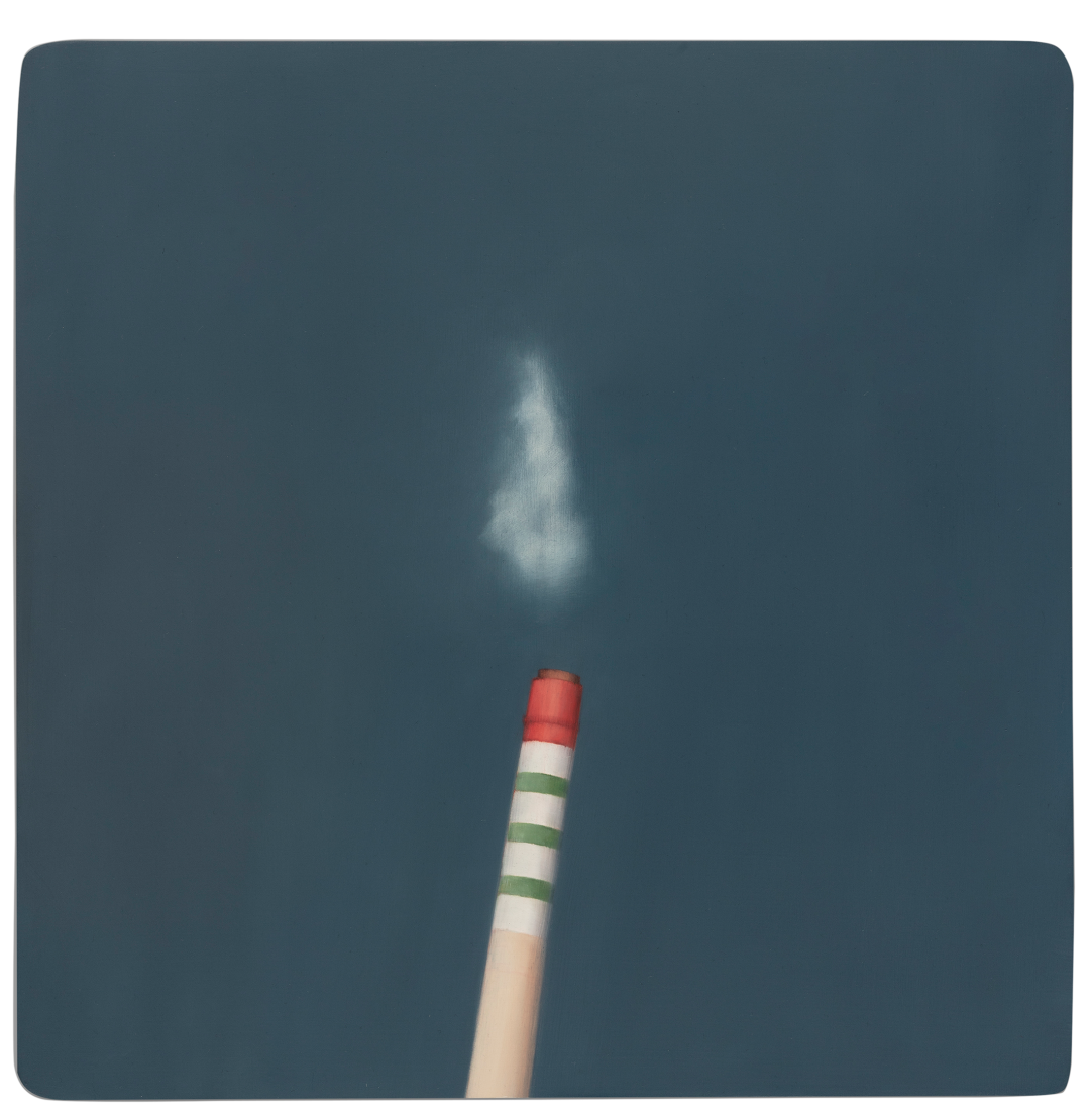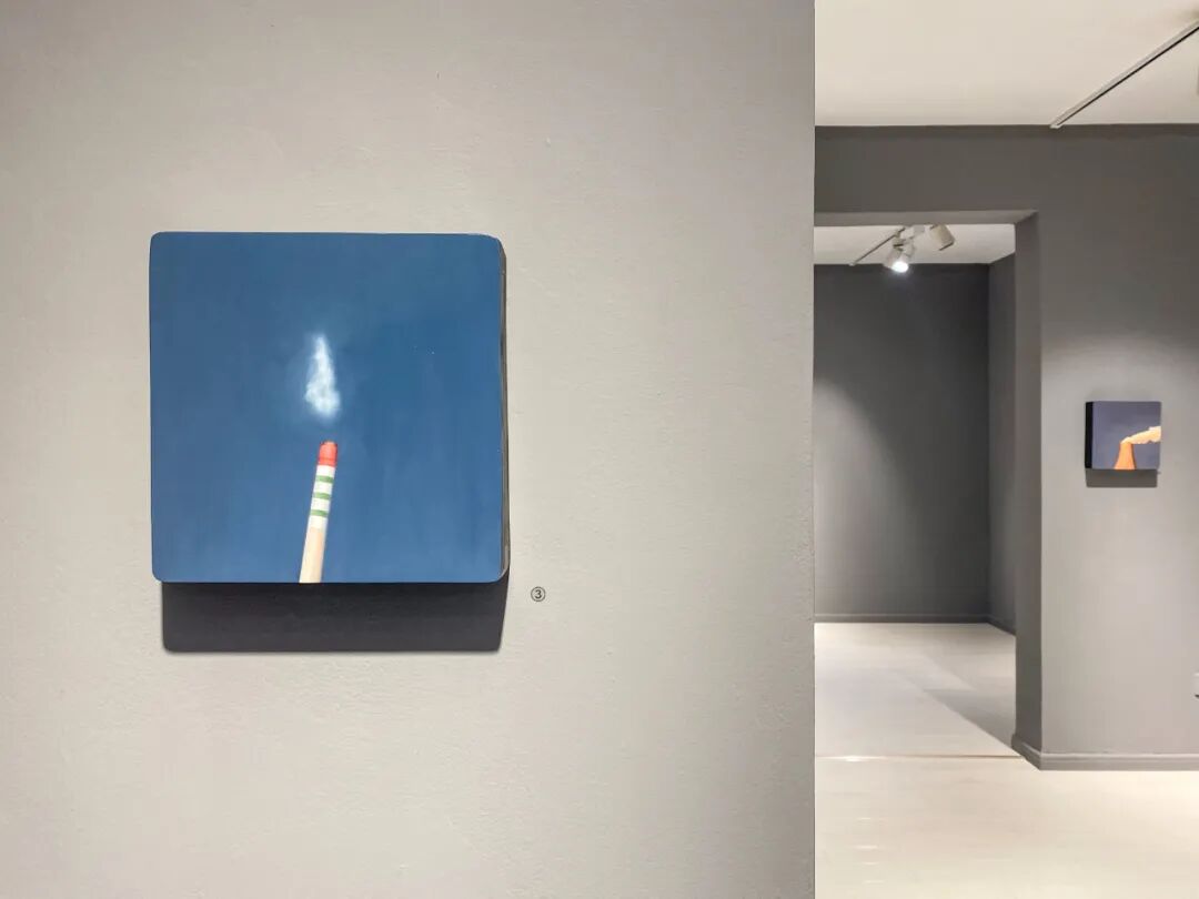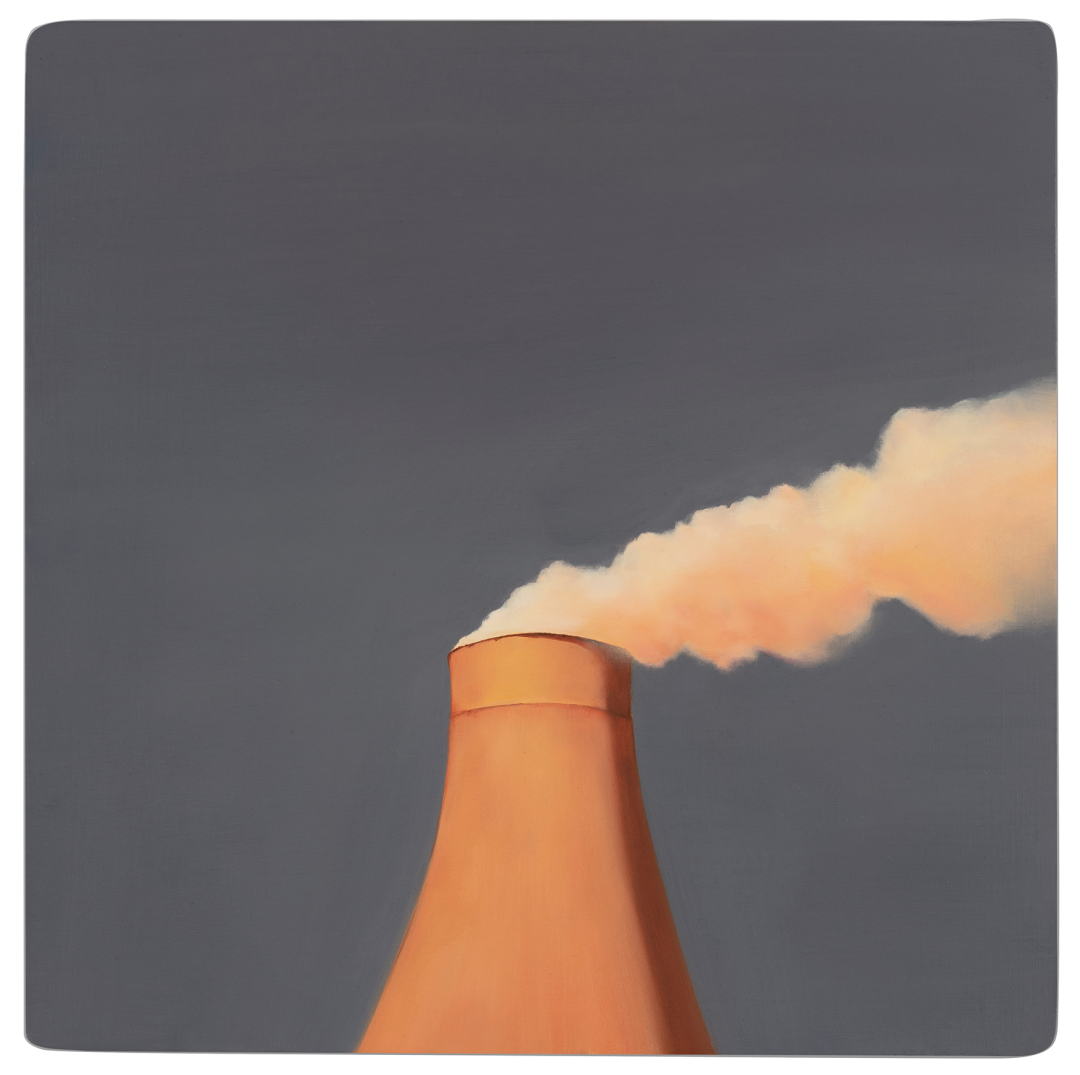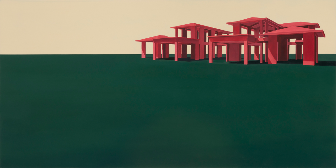 北方的建筑是吕喆很喜欢描绘的题材。他以纯色为基低,绘制房屋、厂房等等建筑。例如《抱》以蓝天为背景,大幅度留白,接着在画板下方四分之一处绘制一个红色金属环抱的塔顶或是烟囱高耸入云的画面。这是一个非常有趣的视角,艺术家并不去绘制整栋建筑。现在的人们都只顾低头看手机,自己的视野变的越来越小,抬头去看向天空,看向远方的时间越来越少。吕喆的绘画,唤起了我去重新观察周边事务的心情。作品表达了艺术家本人的情感,而艺术传达给我们的是一人一思,让我们自己去体会,去思考感受更多作品之前,艺术家情感表达之外,更多的东西。