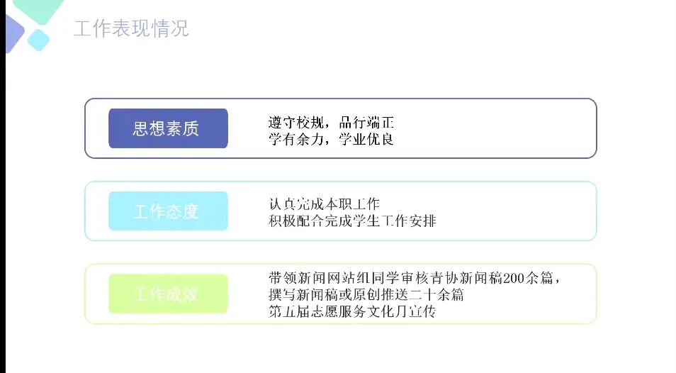 工作成效:带领新闻网站组同学审核青协新闻稿200余篇,撰写新闻稿或原创20余篇。