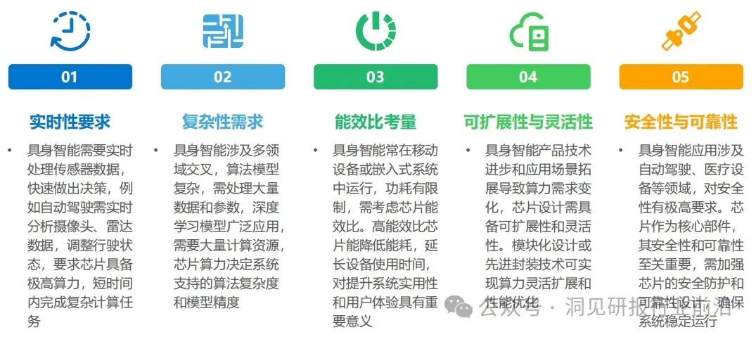 具身智能强调智能体与环境之间的物理交互和实时响应,而AI芯片作为实现这一目标的关键,面临着越来越高的算力要求,这主要体现在实时性、复杂性、能效比、可扩展性与灵活性,以及安全性与可靠性等方面。