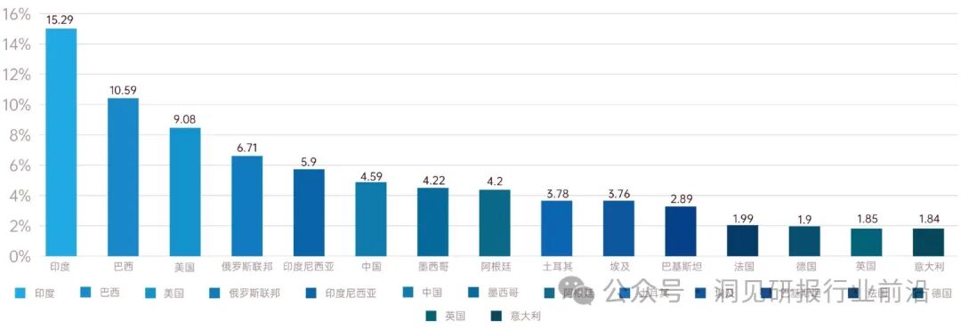 其中印度(42亿)仍然是下载量最大的市场,占据15.29%。巴西(29.9亿)位居第二,超过了美国(25.7亿)。泰国(3.574亿)由于急剧下降(-8.6%)退出了排名。