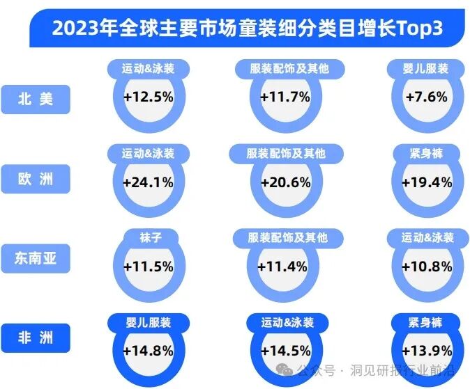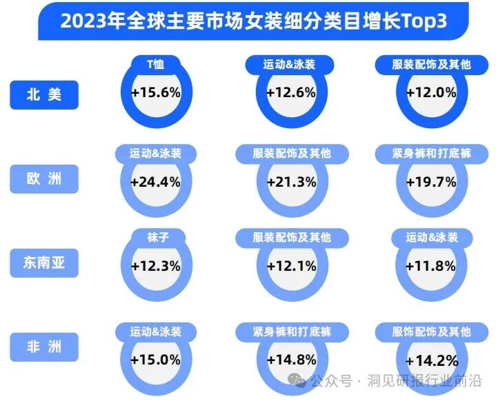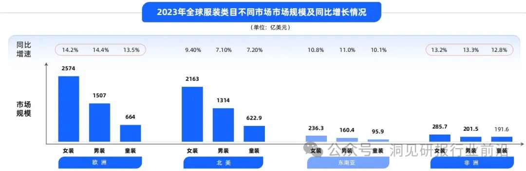 2023年,欧美市场仍是全球服装消费的主力市场,两者合共占据了全球服装消费大盘54.4%的比例。从增长态势看,欧洲、非洲市场增长迅猛,平均增速分别为14.1%、13.1%,超过全球整体(10.9%)。