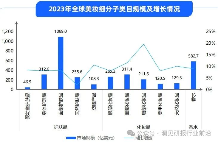 美妆市场主要由护肤品、化妆品及香水三大品类构成。从市场表现看,护肤品类是规模最大的细分赛道,2023年市场规模为1812亿美元,占整体美妆消费比例超过五成。化妆品类则是增长最快的细分赛道,2023年增速达到11.6%,高于整体增速(8.9%)2.7个百分点。