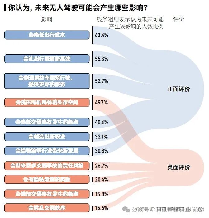 对于无人驾驶,大众普遍关心安全性(87.3%)、出行效率(60.3%)和价格(53.9%)这三个因素。