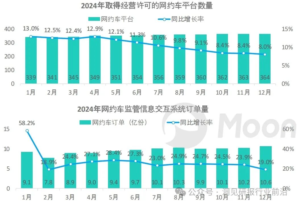 2024取得经营许可的网约车平台数量稳定逐月增长,截至年末达到360家以上,较去年同期增长超8%;各地共发放网约车驾驶员证、车辆运输证均创新高,在行业预警和强监管并存的背景下,增速在下半年有所放缓。