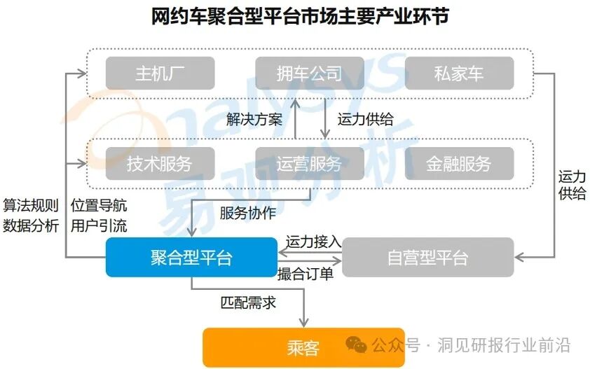 聚合平台利用平台经济模式整合多个网约车企业的运力资源,撮合网约车服务订单,并向自营型网约车平台提供算法规则、位置导航、数据分析等服务,以获取交易服务佣金。