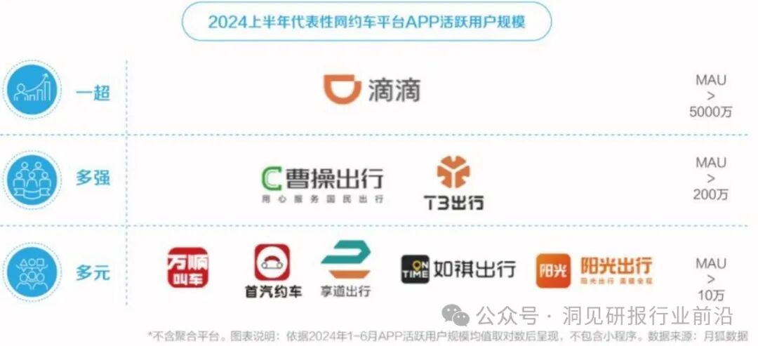 从代表性网约车平台来看,行业依然保持着“一超多强”的竞争格局,头部企业的地位相对稳固。滴滴出行凭借超1亿的月活跃用户规模(MAU)处于绝对领先地位。T3出行、曹操出行等自营平台以超过200万的MAU在市场中占据着重要位置。