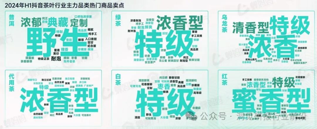 2024年H1,抖音茶叶行业丰力品类热门商品卖点呈现出差异化特征、普洱野生茶受到消费者青睐;绿茶、乌龙茶、白茶则以特级等级满足消费者对高品质的追求。