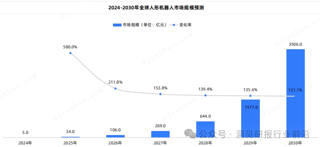 随着人工智能技术的不断突破,人形机器人行业备受关注, 未来行业将持续保持高速率发展。据预测,到2030年全球人形机器人市场规模将达到3506亿元。参考中国服务型机器人市场约占全球市场的25%,2030年我国人形机器人市场规模预计将达到876.5亿元。