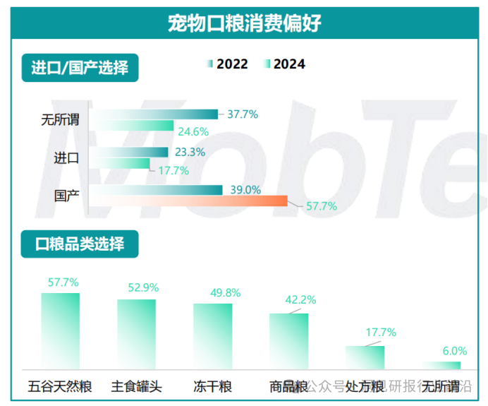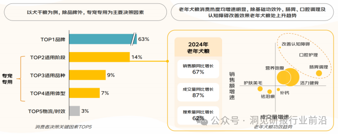 养宠人消费决策从品牌延伸至适龄、适种、适体型,专宠专用趋势明显,以犬干粮为例,适用阶段、品种、体型进入TOP5关键决策因素2024年老年犬粮销售额同比增长67%,成交量同比增长87%,搜索增长62%,除基础功效外,添加特定成分调理肠胃、口腔、改善认知障碍”的老年犬粮处上升趋势。