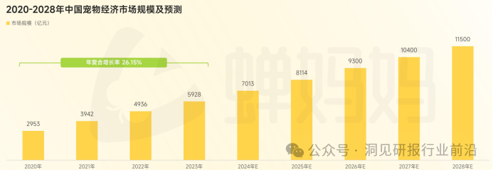 在这样的背景下,中国宠物经济正处于蓬勃发展的黄金时期,2020年至2023年,中国宠物市场年复合增长率为26.15%,预测市场规模将持续上升,2028年市场规模将达11500亿元。