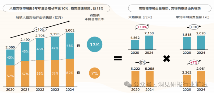 近五年来,宠物市场稳步增长,销售额年复合增长率约10%,宠物猫行业增速达13%, 销售额逐渐追平犬类。 数量角度而言,宠物猫增长更快,五年复合增长率达10%,宠物狗虽然数量增速变缓,但单宠年支出仍高于猫,且增速更快。