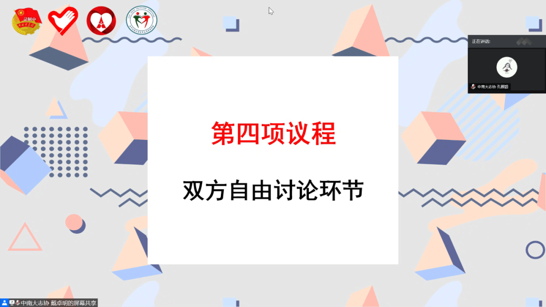 会议第三项议程为双方自由讨论环节。在该环节中,双方代表畅所欲言,互相分享志愿活动的经验与心得。中南大志协代表首先提出问题,就如何加强校青志联与院青协、服务队及公益社团之间的联系进行探讨交流。华大青志联办公室主任钱思颖强调办公室的中枢纽带作用,即与各学院青协多交流并充分听取他们的意见。之后,双方就志愿者招募方式、志愿会平台的职能、志愿服务项目培育等问题进行了深入的探讨和交流,提出了新方法,借鉴了新思想,开拓了新境界。通过指出各自的困惑,分享各自的经验,双方对志愿工作的开展有了更清晰的认识与更明确的规划。