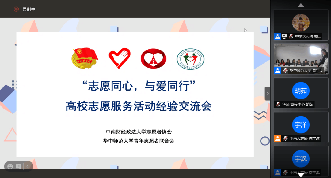 华大青志联讯 随着后疫情时代的来临,志愿工作出现新态势。在继续保证常规疫情防控工作有序进行的同时,为稳步推进志愿服务活动的开拓创新,达到互学互鉴的目的,10月31日上午,中南财经政法大学志愿者协会(以下简称“中南大志协”)与华中师范大学青年志愿者联合会(以下简称“华大青志联”)于腾讯会议平台举行了线上志愿服务活动经验交流会。