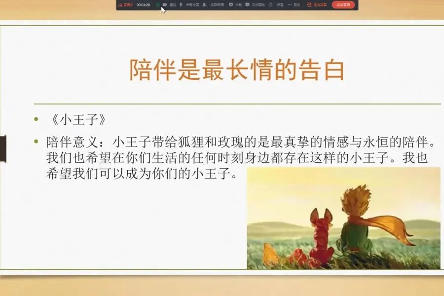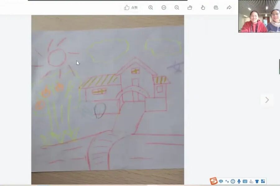 直播伊始,志愿者们通过一段节选自《小王子》的无声视频,让学员们集中注意力体会视频中人物之间的感情,同时也引入此次直播的主题——陪伴。接着,志愿者组织学员们进行“画房子”的游戏。学员们拿出提前准备的纸、笔,绘出脑海中的房屋。完成图画的绘制后,学员们在志愿者的鼓励下互相分享自己的作品。