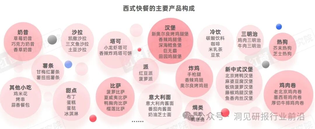 西式快餐:产品种类简单,主要菜品有汉堡、炸鸡、著条及披萨等,具备热量高、营养程度较低的特点,以快速便捷、标准化的服务模式著称。