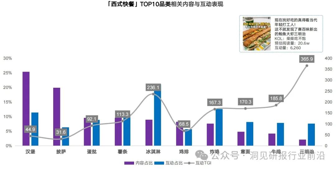 从西式快餐TOP10细分品类内容与互动表现上看,汉堡和披萨仍是该赛道的主力品类,作品量占比达到近50%。