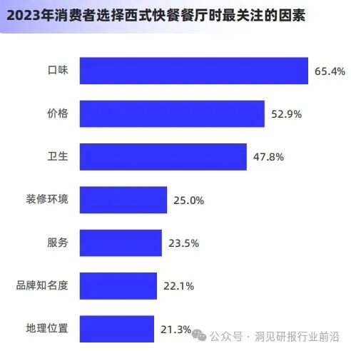 在选择西式快餐餐厅时,口味、价格和卫生为消费者最关注的前三大因素。