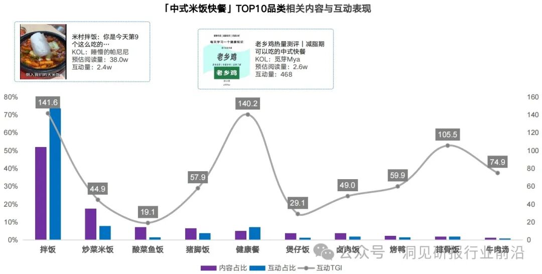 从中式米饭快餐TOP10细分品类内容与互动表现上看,拌饭和炒菜米饭仍是该赛道的主力品类,作品量占比达到近70%。