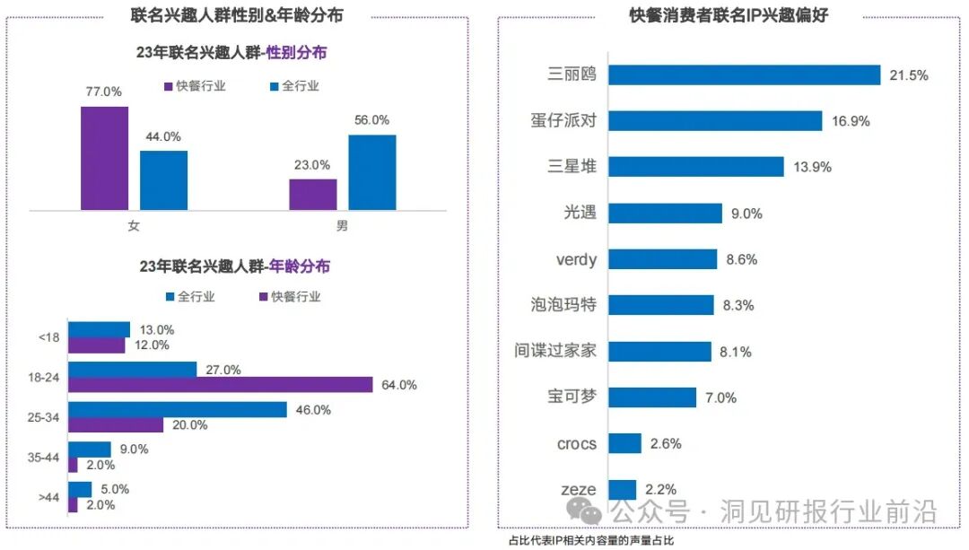 相较于全行业,快餐赛道的IP联名更加吸引女性、18-24岁年轻人群关注。