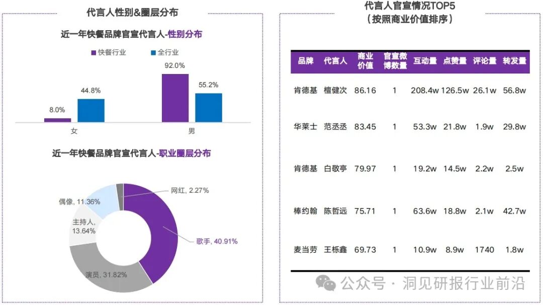 相较于全行业,近一年快餐品牌官宣代言人男性占比明显更高,从代言人所属圈层分布来看,歌手、演员类代言表现更加突出。