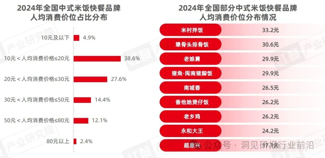 人均消费价位在30~50元,以及50~80元区间的中式米饭快餐品牌占比均超过10%。