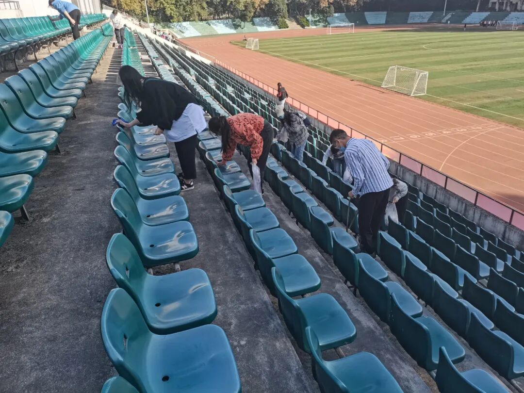 当日上午,志愿者准时到达佑铭体育场。本次活动正值运动会后,清扫工作量整体较大。在完成了志愿者签到、志愿者分组、指派三个小组长等工作后,各小组长便将本小组成员带到指定场地,自行分配任务,开始清扫。活动的主要内容为擦拭座椅表面和扫除走道垃圾。各组长的合理分工,使得活动得以顺利进行。成员王子娜在感悟中提到:“合理有序的分工合作,可以提高团队效率,达到整体大于部分之和的效果,在日常学习生活中可以借鉴,提高效率。”