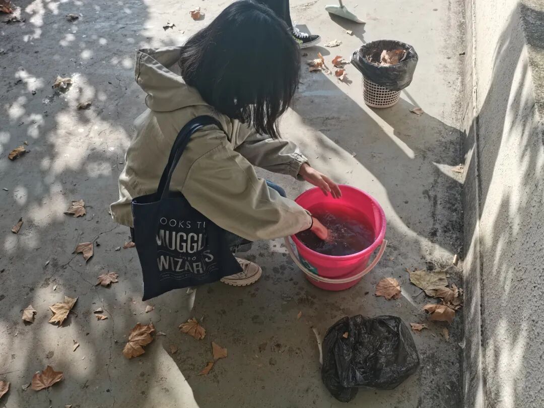 第二组的负责区域相对较少,因此率先完成了清扫任务。由于成员对清扫内容不甚了解,清扫结果也出现了一些问题,于是孟恒检查并指出了这些问题。第二组的成员们认真听取了意见,并进行了返工,力求将活动内容做到完美。第三组负责的区域落叶较多,清理较为困难,在其他组的成员高效完成本组工作后,主动向第三组提供了水桶换水、清洗抹布等帮助。在合作中,小组成员之间更加团结,志愿者们也对劳动教育和环境保护有了更深层次的理解。成员王孟棣感悟到:“一次性产品对环境的危害是非常大的,我们都应该减少一次性产品的使用,为保护环境贡献自己微薄的力量,这样既可以减少白色污染,也能为保护树木做出自己的贡献。”