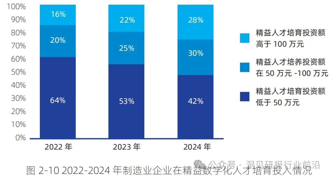 从每年在精益数字化人才培养上投入的金额来看,投入50万以上企业占比从2022年的36%,增长至 2024年的58%。