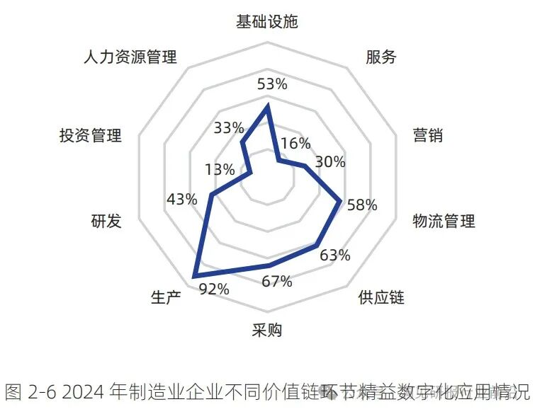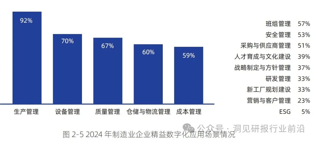 生产仍然是精益数字化应用最集中的场景,此外企业还在设备管理质量管理、安全管理及班组管理等直接关联生产的核心领域应用精益数字化,实现了生产流程的全方位优化。