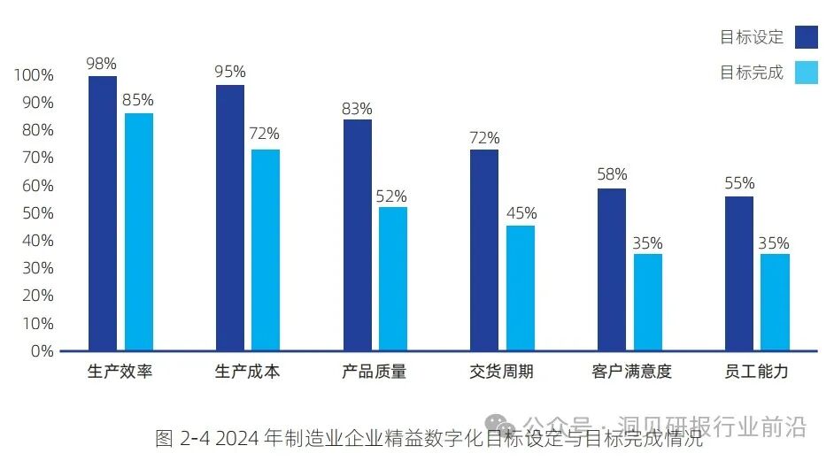 调研发现,有超过 95%的企业把提高生产效率与降低生产成本作为精益数字化实践的首要目标。同时,也分别有83%和72% 的企业希望通过精益数字化实践提升产品质量、缩短交货周期。