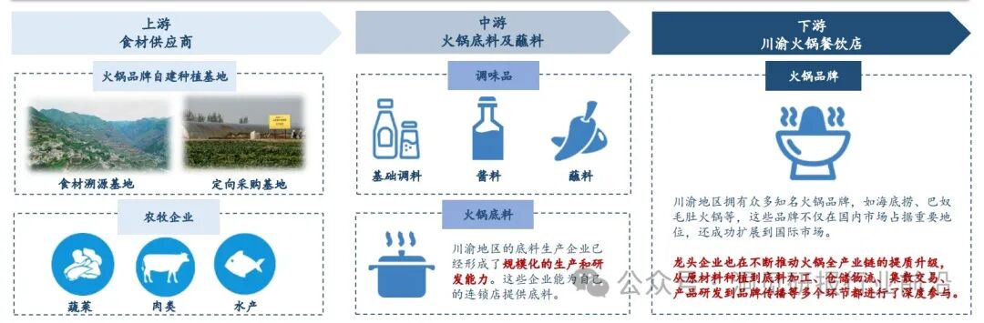 川渝火锅市场产业链条完整,龙头企业积极完善全产业链布局,深度参与上游的食材供应、中游的底料生产、下游的餐饮服务,表现出强大的竞争力和发展潜力。