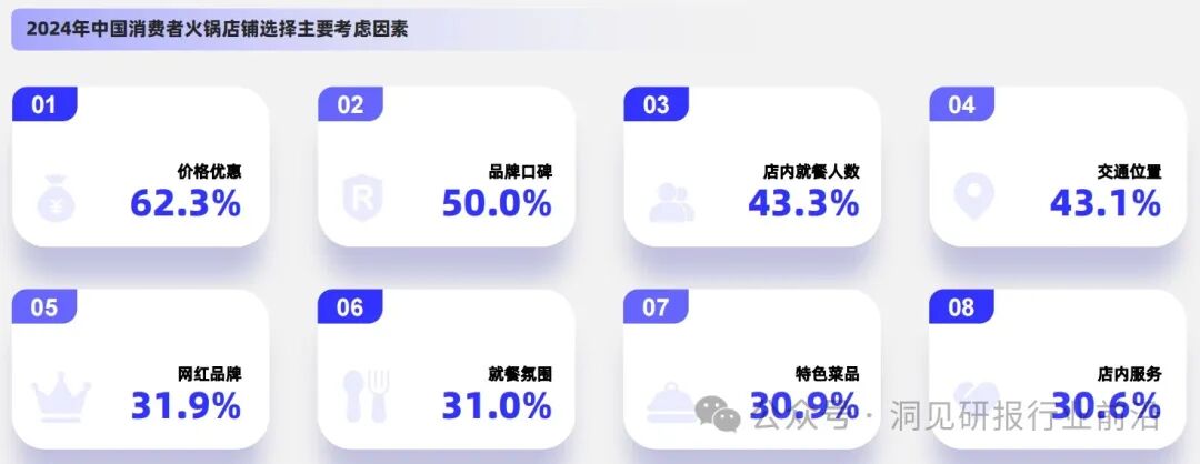 消费者在关注火锅店的价格是否优惠的同时,品牌效应也在消费者选择中发挥作用,如口碑、店内环境、特色菜品等。在目前激烈的火锅市场竞争中,物美价廉的品牌建设对企业而言非常重要。