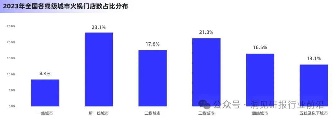 火锅门店在新一线城市分布最多,占比23.1%,在二线及以上城市门店数占比达到49.1%。