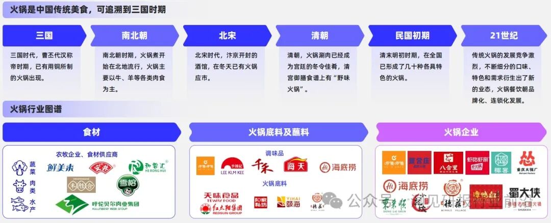 火锅的历史可以追溯到三国时期,历经千年发展形成如今派系众多的火锅品类。火锅种类丰富,全国各地风味差异大,辣味最受欢迎。
