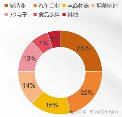 从行业应用结构来看,制造业、汽车工业、和电商物流是物流机器人最主要的应用领域,占比合计达60%以上。其中制造业占比最高,为25%。