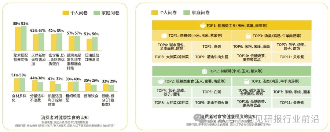 无论个人或家庭消费,人们更加关注饮食的营养、品质及安全保障。“荤素搭配,营养均衡”、“天然新鲜,无有害添加”、“富含蛋、奶、鱼虾等优质蛋白”已成为位列TOP3的健康共识。作为理想型健康食物,粗粮类主食(玉米、紫薯、南瓜等)、杂粮粥 (小米、玉米、紫米等)、汤类(鸡汤、牛羊肉汤等)备受欢迎。