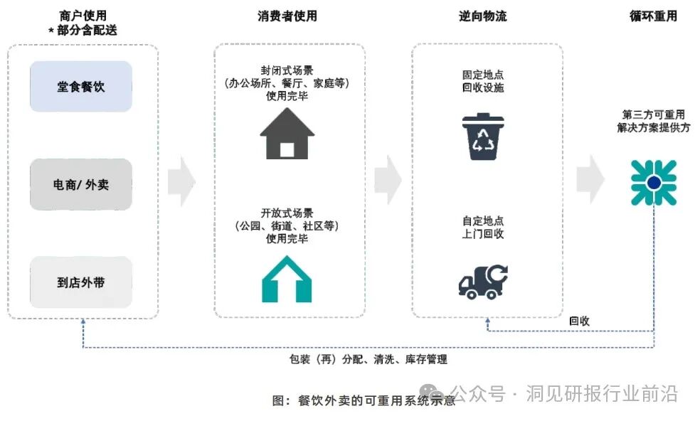 可重用(reuse)模式指一套由包装提供方、使用方、消费者等组成的综合系统。可重用包装在系统内循环使用,各流程节点的所有权均为系统内提供方所有。这一系统提供可重用容器并负责内容物灌装、配送、回收、清洗和重用环节。