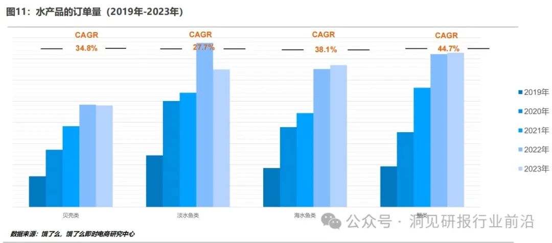 贝壳类四年复合增长率34.8%,淡水鱼类四年复合增长率27.7%,海水鱼类四年复合增长率38.1%,蟹类四年复合增长率44.7%。
