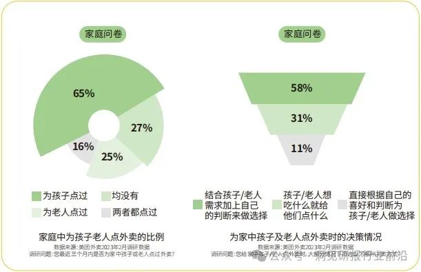 外卖已不再是年轻人的专属,这种省时省力的用餐方式已渗透逾一半的家庭场景,成为人们除自行做饭之外的首选。其中,65%的家庭给孩子点过外卖,25%的家庭为老人点过外卖。58%的消费者给孩子或老人点餐时,会结合其需求及自身判断来做选择。