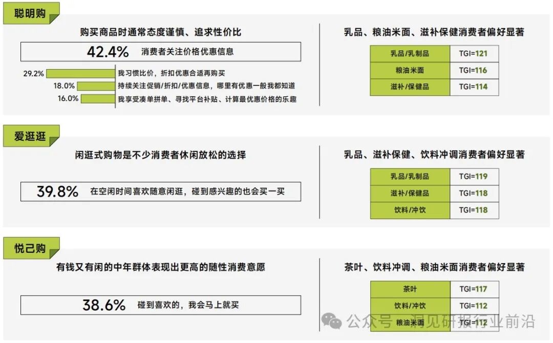 聪明购是食品饮料消费者日常采购商品时最普遍的消费习惯,其次是爱逛逛、悦己购、尝鲜购、直播购、计划购,也有部分消费者倾向于在夜晚21点之后下单。