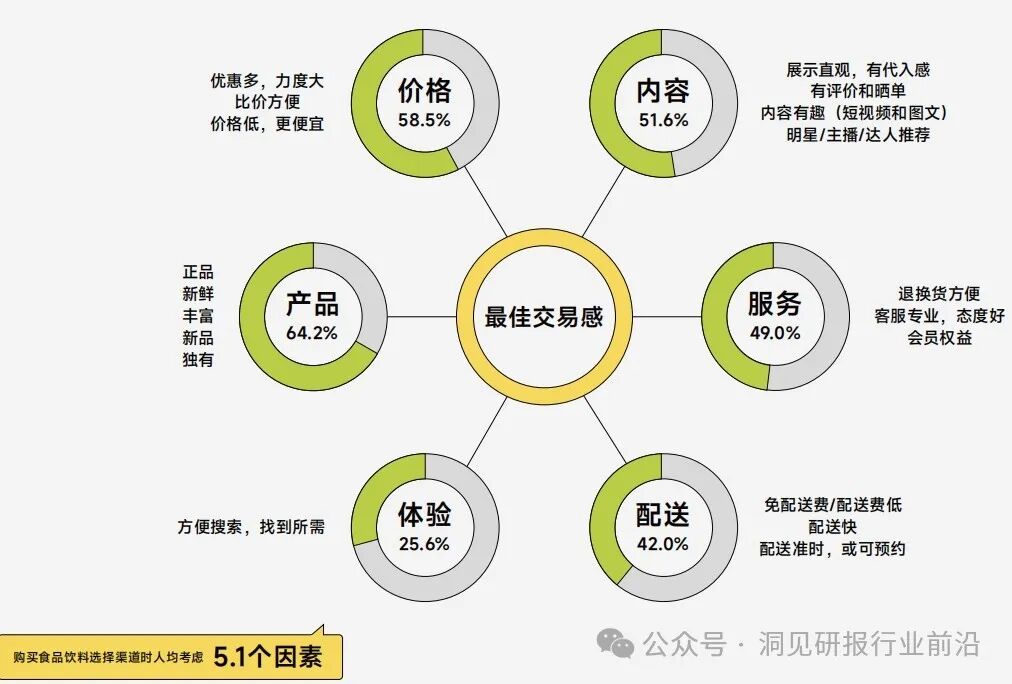 消费者选择食品饮料购物渠道时,考量的是多种因素的融合。在选择食品饮料购物渠道时,消费者人均考虑5.1个因素,在多元、复杂的权衡中获得最佳交易感是促成消费者下单的核心驱动因素。