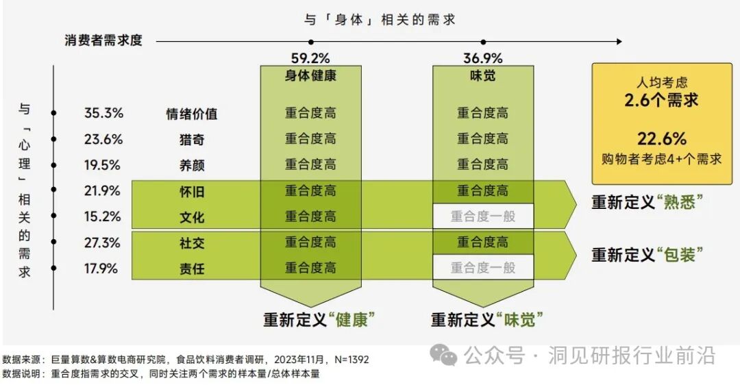 消费者在购买食品饮料时,除了满足基本饱腹之外,最关注的是对身体健康有益、满足味觉和获得情绪价值。整体来看,除饱腹之外,人均至少考虑2.6个需求,22.6%消费者的需求数量超过4个。