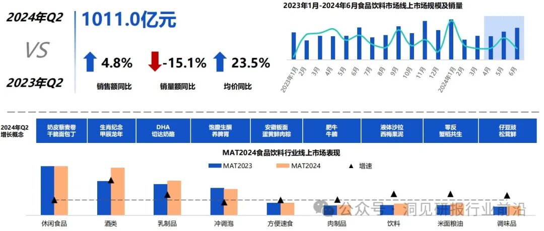 2024年Q2食品饮料市场销售额沃1011.0亿元,相较干上年增长了4.8%。从第二季度各品类增长概念中发现,市场整体向更高品质和更健康的方向发展。