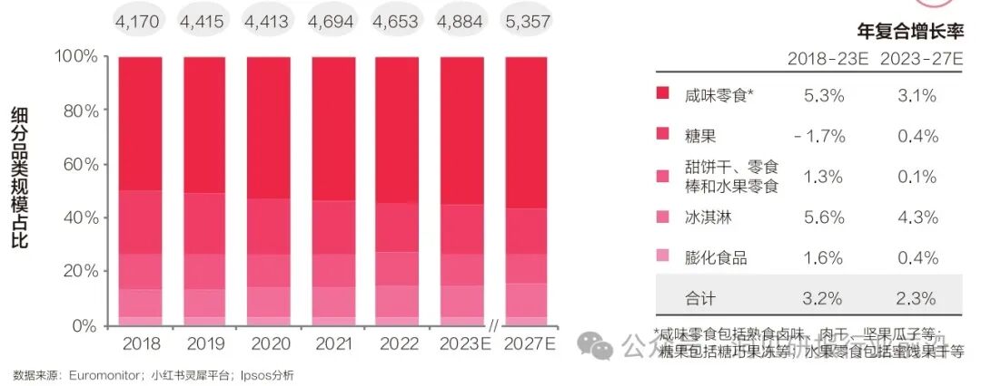 随着人均可支配收入持续增长,生活品质的提升是人们关注的重点,休闲零食市场规模稳中向好。在消费复苏的大背景下2023年休闲零食市场预计同比增长5.0%,市场规模达到4,884亿元人民币。