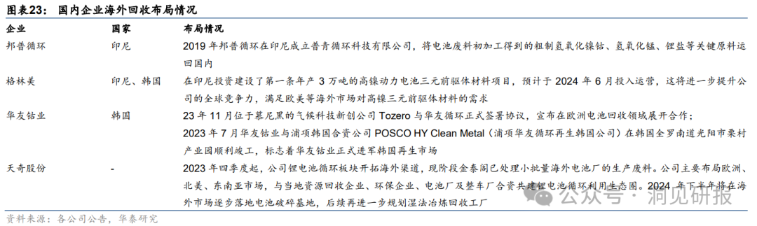国内企业在动力电池回收利用方面不断推进技术创新,采用湿法和火法相结合的工艺,实现了动力电池中稀有金属如锂、镍、钴的 高回收率和高纯度。相比之下,欧美等发达国家主要采用火法技术,即高温熔炼的方式提取金属,尽管可实现高回收率,但也存在能耗高、污染大、成本高、锂损失大等问题。中国采用的湿法技术,即化学溶解金属,尽管处理时间长、废液难处理,但耗能低、污染小、 成本低、锂回收高等优点明显。在碳足迹统计电池整个生命周期排放量的要求下,预计湿法技术更具优势。中国企业在湿法技术方面积累了丰富经验,提高化学试剂使用效率、降低再生利用环节能耗成本将成为电池回收企业提升优势的重要策略。