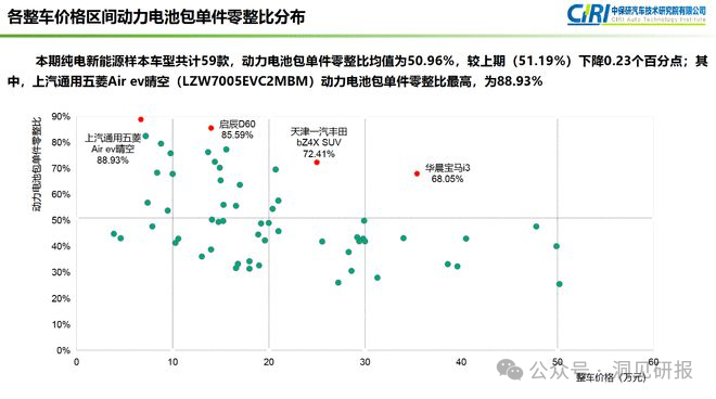中保研研究结果显示,动力电池包单价占比确实不低,平均占整车销售价格的51%左右,高者甚至可达89%。虽然电池包零整比有所下降,较上期下降0.23%,但还是维持在较高水平。“新能源汽车更换电池的费用包括电池本身成本、更换电池所需其它耗材成本、人工安装成本等方面,电池组每度电的成本大概在800元以上。”
